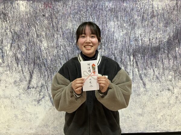 3日(水)第34回全国高等学校文化連盟将棋新人大会に出場した堀美琴さんが、先日行われた全国大会の結果を報告してくれました。予選リーグを3勝1敗で勝ち上がり決勝トーナメント出場を果たしました。同窓会から激励金をお贈りしたところ、天童市の駒サブレをおみやげにいただきました。現在将棋部の女子部員は3名。団体戦での活躍も期待しています。