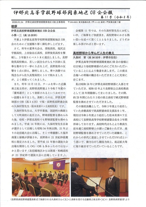3日(水)「伊那北高等学校野球部関東地区OB会報」第11号が、編集を担当された御子柴一彦さん(高36)より同窓会事務局へ届きました。本号では、選手として、さらに母校監督して野球部を指導して、現在長野県高等学校野球連盟会長を努める久保村智さん(高36)の手記「高校野球から学んだ人生」が7ページにわたって掲載されています。その冒頭部分を紹介します。手記には大勢の方のお名前が登場します。皆さんの力を結集して活動を展開されてきたことが伝わってきて、胸が熱くなりました。