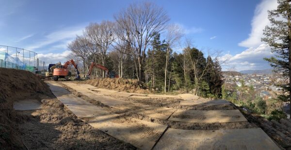 6日(金)午後3時の工事現場の様子です。音楽・家庭科棟はほとんど撤去され、コンクリートの基礎を残すだけになりました。防音ネットも取り外されています。バックネット裏の伐採現場では何台もの重機が作業を進め、うっそうとしていた森が切り開かれて、市街地が見とおせるようになりました。