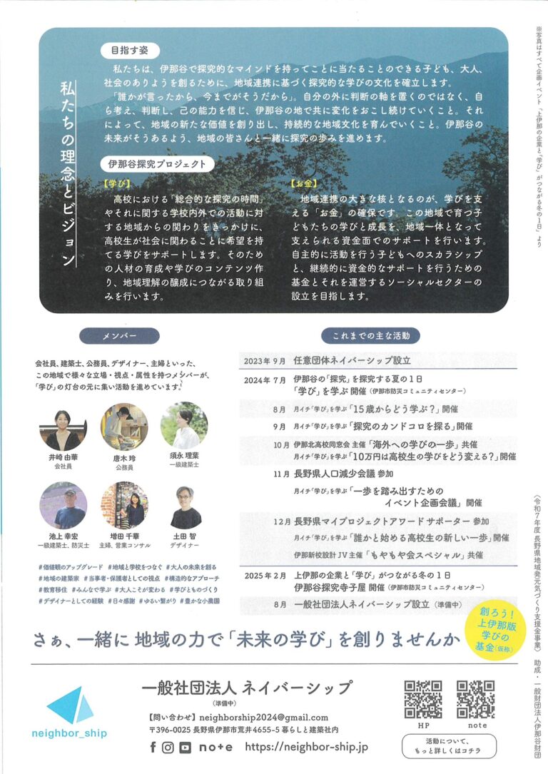 11日(水)伊那市防災コミュニティーセンターで『伊那谷の学びの港~まだ知らない上伊那の高校の「学び」に出会える1日~』が開催されました。上伊那地域8校の高校生が探究活動や部活動の成果を報告。その後参加した大人も加わって小グループで対話する交流タイムが設けられました。プレゼンする側も聞く側も対等な立場で互いに学び合う、暖かな空気に満ちた学びの場です。主催は一般社団法人ネイバーシップ(井崎由華代表=高51)。会社員・建築士・デザイナー・主婦・公務員など、上伊那地域で様々な立場・視点・属性を持つメンバーが集って、〈月イチ「学びを学ぶ」〉企画を開催。地域の力で「未来の学び」を創る取り組みを展開しています。上伊那地域には、上伊那広域連合が主催する「郷土愛プロジェクト」も長年活動を続けています。行政(上伊那広域連合)や住民(一社ネイバーシップ)が展開するこれらの活動が、現在進行中の上伊那の高校再編成を力強くバックアップしています。これが他の地域にはない、上伊那地域の強みであり、宝物です。そんな事を改めて実感した昨日のイベントでした。