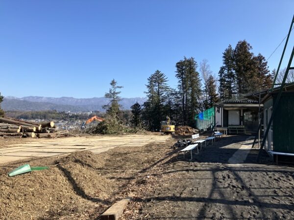 15日(日)の母校の姿です。グラウンド北側の財団が取得した土地では、宮坂沿いの法面の樹木を伐採して見晴らしが良くなりました。この土地は将来、駐車場用地や南門から北門に通ずる通路としての利用が予定されています。昨年から始まった第一期解体工事では、プール・小体・音楽調理室棟が撤去され、ほぼ更地になりました。この場所に4月から西棟の建設工事が始まります。