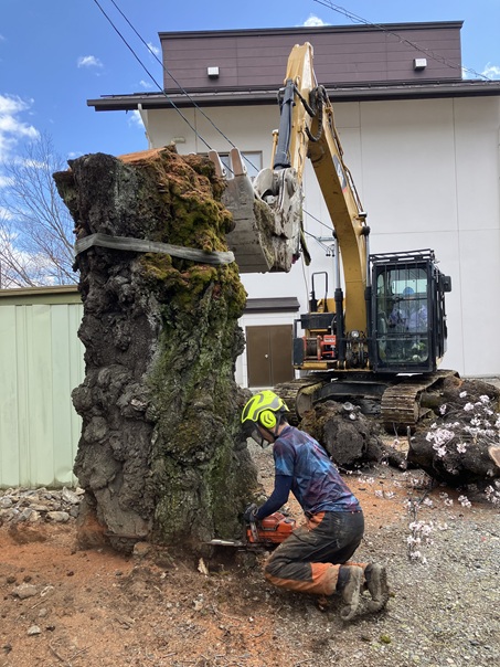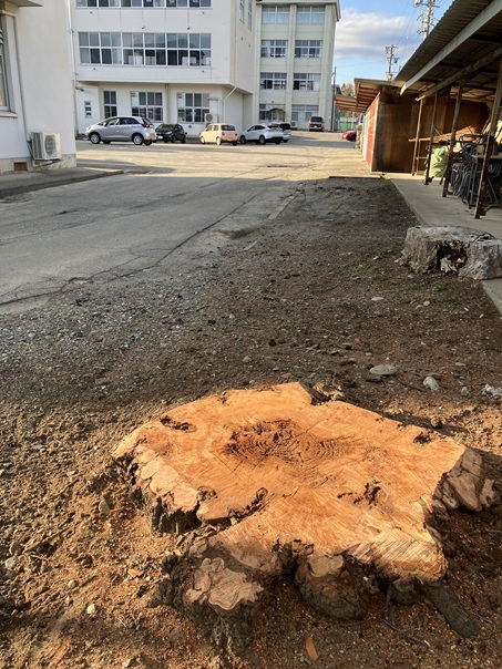 3日(金)、大正10年に中学校1回生が天竜河畔から移植した桜の老樹が1本、惜しまれながら伐採されました。植えてから105年を経過して樹勢の衰えが顕著となり、重機を使って作業が行われました。