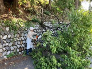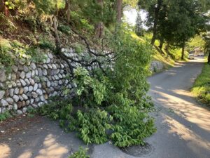 12日(月)朝、市道伊那北学校線(通称一万円道路)入口の斜面に生えていた桜が根本から折れて道路を半分塞ぎました。部活動の指導で登校された宮澤優一先生が見つけて伊那市へ連絡していただき、まもなく市の担当者が駆けつけて支障木が撤去されました。この斜面の樹木は市道改良事業に伴って8月末から伐採される予定でした。