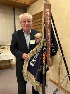3日(日)昭和30年甲子園大会1回戦新庄北高戦を投げ抜いた大槻丞司さん(高9)から、その試合のウィニングボールが同窓会へ寄贈されました。これまで大槻さんの手許で大切に保管されてきた記念の品を同窓会へ譲り受けましたので、同窓会の宝物として末永く管理してまいります。左の写真は昭和30年の信越大会優勝旗(レプリカ)とともに写真に収まる大槻さん。左手に持っているのがそのボールです。メーカーの刻印などなく、高校野球大会とスタンプされています。