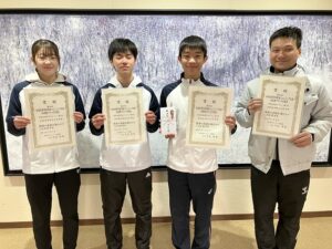 17日(金)から19日(日)に石川県で開催された北信越ブロック予選に出場したフェンシング部の皆さんが健闘して、4チームが3月末に長崎県で開催される第49回全国高等学校選抜フェンシング大会出場を決めました。北信越大会で準優勝以上のチームが参加資格を得られます。女子フルーレ団体優勝、男子フルーレ団体・男子エペ団体・男子サーブル団体はそれぞれ準優勝に輝きました。23日(木)、同窓会事務局へ報告に来てくれたみなさんに同窓会から激励金(大会参加費)を贈呈しました。昨年に引き続き出場する選手から「昨年は勝利したチームもあったが、惜しくも負けたチームもあったので、今年は是非勝ってきます」と決意表明がありました。活躍を祈っています。