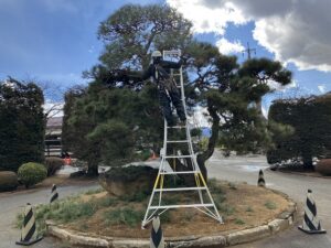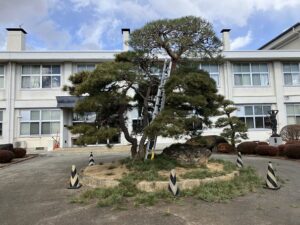 28日(火)学校の職員玄関前のロータリーに植えられている赤松の剪定が行われています。この松が植えられる前にはここに校歌碑が建てられていましたが、玄関前のロータリー改修に伴って移設され、現在の姿になりました。長年の手入れによって枝ぶりがよくなり、来校者を迎えてくれます。伊那新校の建設に伴って植木も影響を受けますが、この赤松はこの場に残されることになっています。