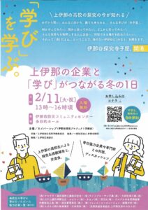 2月11日(火・祝日)に伊那市防災コミュティーセンターにおいて、任意団体ネイバーシップ(伊那谷探究プロジェクト準備会)主催・上伊那地区高等学校長会共催の〈上伊那の企業と「学び」がつながる冬の1日〉が開催されます。伊那谷探究寺子屋と銘打って午前中、高校生の学びに協力いただいた企業15社から校長会へ寄付目録が授与され、この寄付を充てた上伊那農業・高遠・伊那北・駒ヶ根工業の生徒の皆さんが活動報告を行います。午後は2会場に分かれて高校生の探究活動のポスターセッション、さらに高校生と大人(企業も)との交流会が予定されています。上伊那の高校生の探究的な学びに触れる絶好の機会です。ネイバーシップは「地域連携に基づく探究的な学びの文化の確立を目指して、その人材の育成や学びのコンテンツ作り、地域理解の醸成につながる様々な取り組み」を展開しています。地域連携の鍵を握るのが、学びを支える「お金」です。ネイバーシップは今後、資金面での継続的なサポートを行う基金とそれを運営するソーシャルセクター設立を目指しています。上伊那地域の高校生の学びを支える地域連携の取り組みが駆動しています。