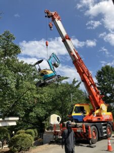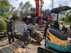 5日(火)コンクリート製の台座に「邂逅の碑」が固定され、その周囲に庭石を配置する作業が行われました。25トンクレーンで石をつり下げて慎重に作業が進められました。