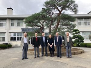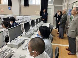 16日(木)、昨夜高遠さくらホテルにて同期会を開いた12回生の皆さんの中から6名が母校を訪問されました。皆さんが高校1年の昭和32年5月、校舎が焼け落ちて不自由な高校生活が始まりました。新校舎が完成したのは2年生の秋。その時に再建された中校舎も今年で67年の時を数えました。この11月から小体育館(昭和37年の建設当時は新体育館と呼ばれました)の解体工事が始まり、中校舎も順次解体されていきます。その懐かしい校舎を巡り、ちょうど中校舎で行われていた物理・保健・英語・情報の授業も参観。3階の生物教室から校舎を眺めました。同窓会館書庫に収蔵している資料もご覧いただき、在学当時の思い出話に花が咲きました。