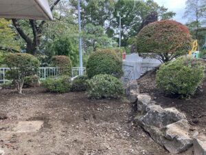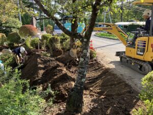 20日(月)21日(火)、2日間をかけて一万年道路(通称)拡幅工事に伴って道路となる部分に植えられていたツツジ類の移植作業が行われました。上2枚の写真の桜はこの場所に残されることになりました。