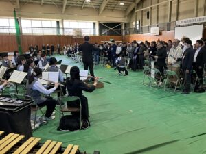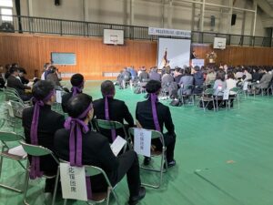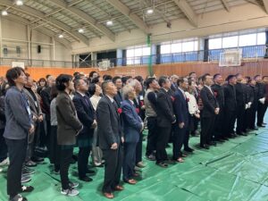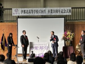 22日(土)快晴無風の絶好な天気に恵まれて、高校47回生「紫那会(しなのかい)」(黒河内貴実行委員長)の卒業30周年記念同窓会が開催されました。全国各地から200名近くの同期生が懐かしの薫ヶ丘に参集。12時30分からクラスごとにホームルーム。14時30分から会場を大体育館に移して記念式典に臨みました。物故者8名に黙祷を捧げ、山岸明校長先生の指揮で吹奏楽部の伴奏による校歌斉唱。黒河内委員長の式辞に続いて酒井茂同窓会長・山岸校長の祝辞。その後恩師のみなさんからお言葉をいただきました。紫那会から同窓会と学校へそれぞれ40万円ずつの寄付金をいただきました。皆さんのご厚意に心から感謝申し上げます。この日のために再結成された応援団は学生服をレンタルして練習を積み重ねて本番に臨み、一糸乱れぬ指揮ぶりで「天竜河畔」をリード。体育館に歌声が響き渡りました。最期に全員で写真撮影をして「記念イベント」へ。まもなく取り壊される校舎を見学して、部活ごとに記念撮影。18時からJAフラワーパレスで懇親会が行われました。薫ヶ丘会館で実行委員の皆さんが在学時にペン祭で踊ったダンスの練習を重ねていたので、懇親会では皆で踊って往時を再現して盛り上がったことでしょう。翌日は朝から実行委員の皆さんが薫ヶ丘会館に集まって後片付けをしてくれました。緻密に計画された記念同窓会でした。これから記念誌の編集が始まります。