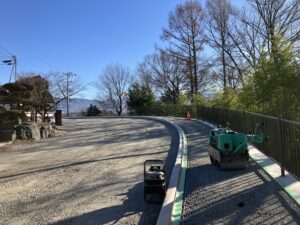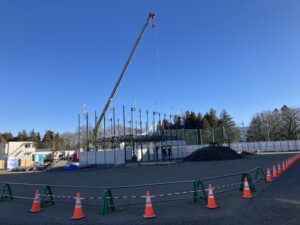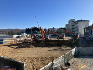 10日(水)の建設現場の様子をお伝えします。一万円道路はいよいよ舗装工事が始まる準備が整いました。5m幅の車道と2m幅の歩道は、11日(木)から舗装工事が始まります。プールとトレーニングルームはすべての建物が撤去されて、ほぼ更地になりました。校庭では音楽教室が入る2階建ての仮設校舎の組み立てが始まり、その東側では体育館棟の基礎工事が進んでいます。3月末までには仮設校舎(第Ⅰ期)が完成の予定です。