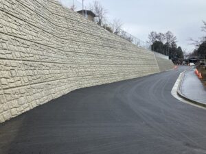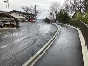20日(土)本日から一万円道路の通行ができるようになりました。写真は舗装工事が完了した市道伊那北学校線(通称一万円道路)です。18日、19日に舗装工事が行われ、舗装したばかりの黒いアスファルト道路が雨をはじいています。昨年8月に道路脇の樹木の伐採が始まり、1年半をかけてほぼ完成となりました。道路が拡幅されて車の対面通行が可能となり、歩道ができて歩行者の安全も確保されました。