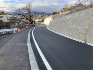 22日(火)14時から同窓会館に伊那市建設課の皆さんをお招きして、山寺区長・学校長・地元15組代表・同窓会副会長が集まってほぼ完成した市道伊那北学校線(一万円道路)の今後の運用を協議しました。協議事項は、交通安全・除雪・草刈り・道路周辺の土地利用など。現場を見て歩いた後、会議室で意見交換を行いました。この日はちょうど白線を引く工事が予定されていて、現地で要望をお伝えすることができました。下の2枚の写真は白線が引かれた直後の様子です。