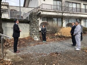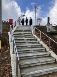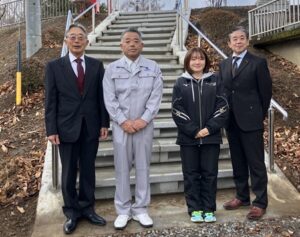 26日(金)一万円道路改良工事に伴って新設された通学路の階段が完成して、今日から使用開始となりました。学校は今日が年内最後の授業日。下校時には生徒の皆さんにこの階段を利用してもらえます。そこで、お昼休みを利用して校長先生、生徒会長、同窓会副会長と施工していただいた西部建工(株)の現場代理人に集まっていただき、階段登り初めのセレモニーを行いました。
