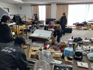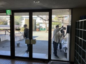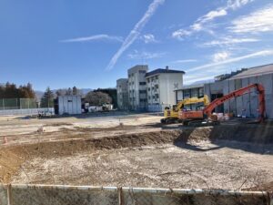 28日(日)同窓会館で活動している吹奏楽部の皆さんが今年最後の練習を終え、午後会館の大掃除をしています。お盆と年末に行われる恒例の大掃除。日頃の感謝の気持ちを込めて念入りに掃除をしてくれています。学校の解体工事と仮設校舎建設工事の現場では、26日(金)に年内の作業を終えました。その現場の姿を写真で紹介します。家庭科音楽棟が建ち上がり、体育館の基礎工事が終わりました。プールは完全に更地となりました。