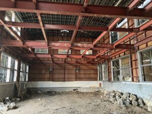 1日(日)の校舎解体現場と仮設校舎です。小体はすべて解体されて防音シートが撤去されました(左上写真)。音楽・調理室棟は壁と屋根を残すだけとなり、内部はきれいに片付けられています(左下写真)。校庭に建設されている仮設校舎は、手前の音楽・調理室棟がほぼ完成してエアコンが設置され、奥の体育施設は外装が完成して内装工事の最中です(右下写真)。順調に工事が進んでいます。