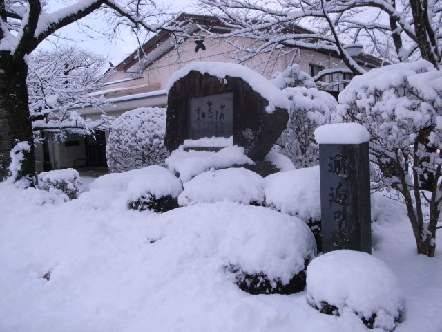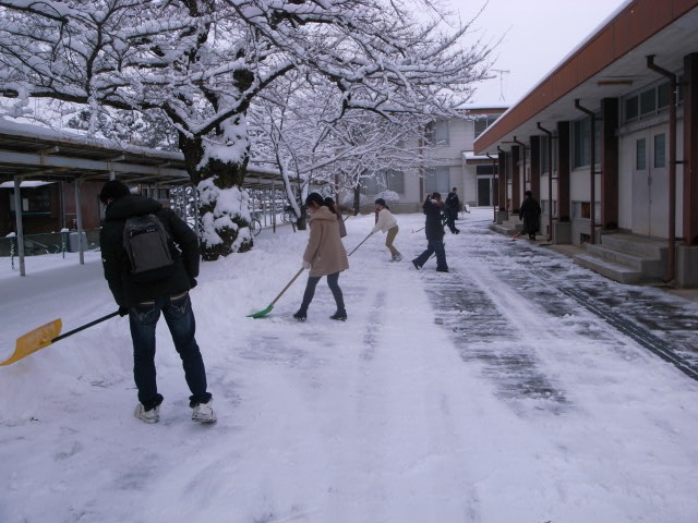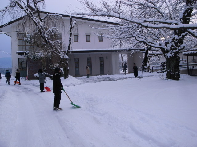 今年2回目の雪の朝となりました。「天真」の像や「邂逅の碑」も、すっぽりと雪に覆われ、あたり一面銀世界が広がりました。伊那北高校では、雪の日には朝早く登校した生徒が自主的に雪かきをしています。本日も7時前から、野球部がまず伊那北駅から学校までの通学路の雪かきに出かけていきました。校内の雪かきは、登校してきた生徒が順次取りかかります。高志館前では、吹奏楽部の生徒が雪かきをしていました。このような雪かき文化が伊那北高校には根付いています。
